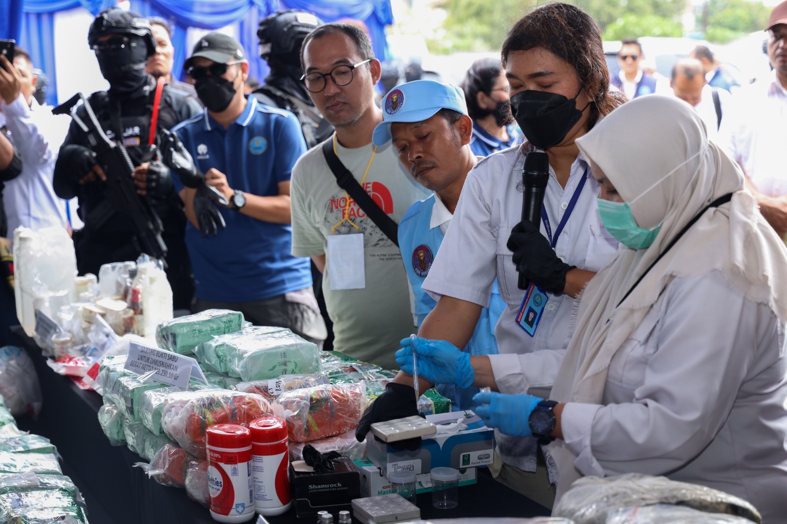 Barang bukti narkotika yang dimusnahkan meliputi 113.230,10 gram sabu; 318 ml sabu cair; 233.866,21 gram ganja; 5.044 butir dan 28,18 gram ekstasi; 3.911 ml prekursor cair: 1.064 gram prekursor padatan; 2.602 ml cairan bahan kimia; serta 1.300 gram bahan kimia padatan. Sebelumnya, total barang bukti yang disita mencapai 113.653,66 gram sabu; 329 ml sabu cair; 235.113,13 gram ganja; 5.085 butir dan 29,14 gram ekstasi; 3.911 ml prekursor cair; 1.064 gram prekursor padatan; 2.602 ml cairan bahan kimia; serta 1.300 gram bahan kimia padatan. Dari jumlah tersebut, sebagian barang bukti disisihkan untuk pemeriksaan laboratorium dan keperluan penelitian, teknologi, atau pelatihan (IPTEK/Diklat), yaitu 423,56 gram sabu; 11 ml sabu cair; 1.226,60 gram ganja; serta 41 butir dan 0,96 gram ekstasi.