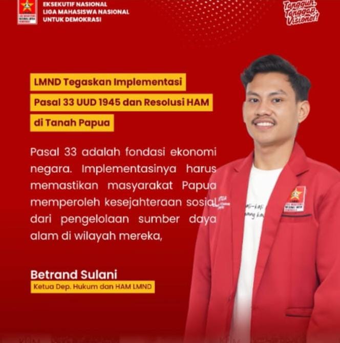 Jakarta – Betran Sulani, tokoh Liga Mahasiswa Nasional untuk Demokrasi Pusat sekaligus mantan pengurus LMND DKI Jakarta, menegaskan bahwa pendekatan dialog merupakan solusi utama dalam menyelesaikan konflik di Papua. Ia menilai pendekatan militer semata tidak akan menyelesaikan akar persoalan, justru berpotensi memperpanjang ketegangan di wilayah tersebut.